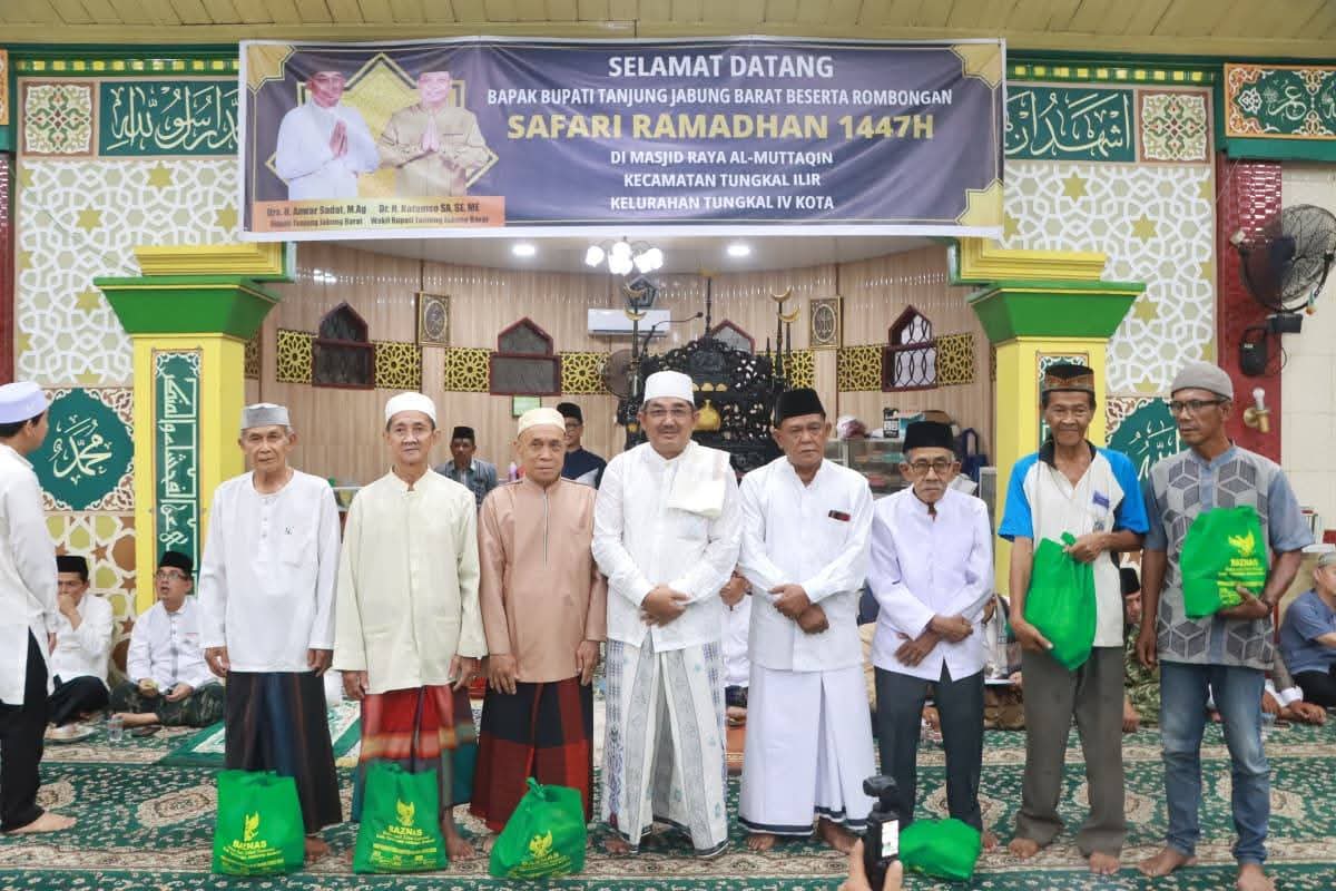 KUALA TUNGKAL, Medialapanenam.com – Pemerintah Kabupaten Tanjung Jabung Barat (Tanjab Barat), bersama Tim Safari Ramadan dari Universitas Jambi menggelar kegiatan Safari Ramadan 1447 H sekaligus memperingati malam Nuzulul Qur’an di Masjid Raya Al-Muttaqin Kuala Tungkal, Kelurahan Tungkal IV Kota, Kecamatan Tungkal Ilir, Jumat (06/03/2026).